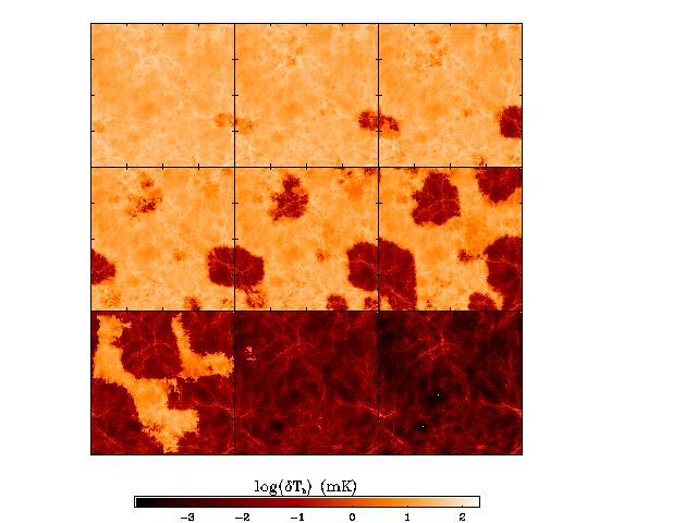 simulated images of the 21 cm signal as ionized bubbles appear, grow,