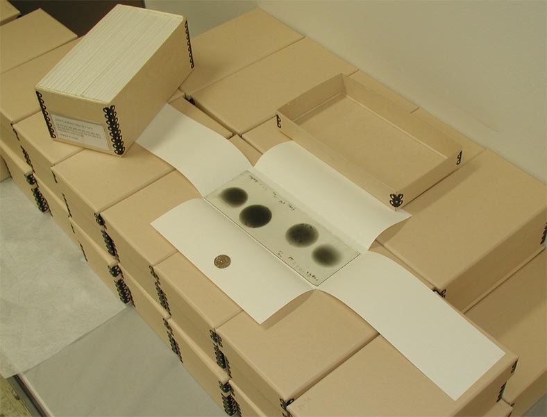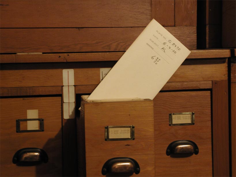 The Ca K plates have been stored in paper envelopes housed in wooden cabinets. The large collection of these plates exceeded the drawer space and some groups of plates were stacked in boxes. The more vulnerable groups have been relocated. The wooden boxes emit gasses which are harmful to the photographic emmulsion and a part of the project is to move the plates to more inert archival boxes. The top image to the left shows a bank of drawers, most of which on the left are empty. Starting about where the one is pulled out, the drawers contain Ca K plates from the 1950's era. The lower image gives a closeup of the drawer with one plate envelope pulled out. The discoloration of the paper is partly from its higher than desireable acid content and from the action of the wooden box walls.