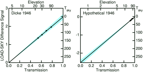 The plot on the left above is the actual data from Figure 3 of the Dicke et al. (1946), although I had to do a fit to find the baseline that was subtracted. As you can see, the extrapolation to 100% transmission is large because of the water vapor absorption and the chopped signal at 100% transmission is large so the gain uncertainty shown in blue leads to a large uncertainty in Tsky. On the right is a hypothetical experiment that could have been done in 1945 with a cold reference at a wavelength not on the water vapor line. If Dicke had used a low temperature load and had observed from a mountaintop instead of Florida, he would have detected the CMB. Ironically, the paper by Gamow describing the hot Big Bang occurs in the same volume of the Physical Review. A later paper by Alpher, Bethe & Gamow describing the hot Big Bang is one of the classic jokes in physics: Gamow added Bethe's name to this paper just to make it sound like alpha, beta, gamma. Bethe actually didn't do any work on it.