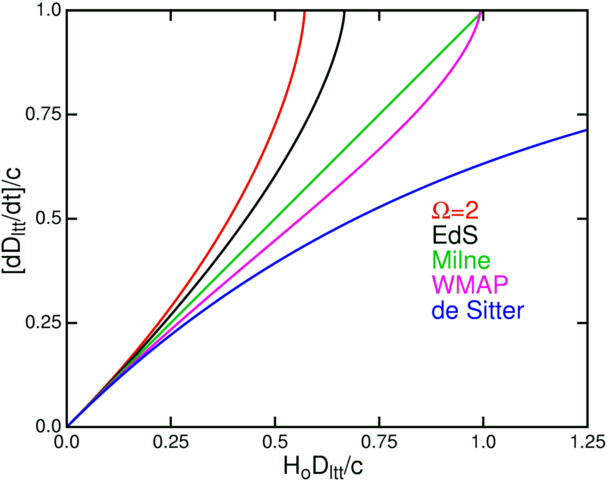 This doesn't really satisfy the simplicity requirement, because a numerate listener will ask: if a distant cluster of galaxies is 9.1 billion light years away in a universe that is 13.7 billion years old, how did the cluster get so far away in only 4.6 billion years? If must have been travelling faster than the speed of light! Apparently it takes several minutes for this question to arise, and by that time the presenters are out the door. So I get an E-mail.