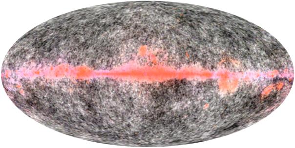 There are two ways to reduce the galactic contamination in CMB anisotropy data. The first way is to make observations in bands where the contrast between the CMB anisotropy and the Milky Way emission is greatest, which are near 70 GHz. The NASA Explorer satellite WMAP has 3 bands at or near this minimum in the galactic emission with microwave designations Q, V & W. The second way to reduce the galactic contamination is to take data in a band where the Milky Way is strong and subtract some of that signal from the bands with weak galactic emission. This internal linear combination technique (ILC) was first used on COBE DMR data by Wright in 1991. The image rollover above illustrates the results: run your mouse over the image to toggle between the internal linear combination "reduced galaxy" map and an RGB image constructed from the WMAP QVW bands (41, 61 and 94 GHz). Both maps are based on the public WMAP 3 year data. The RGB image uses maps smooothed to matching resolutions by Xi Chen of UCLA, while the ILC image is a grey scale display of the wmap_ilc_3yr_v2.fits file from the LAMBDA data center. See Hinshaw et al. (2006) for a more complete description of the map making and the ILC method.