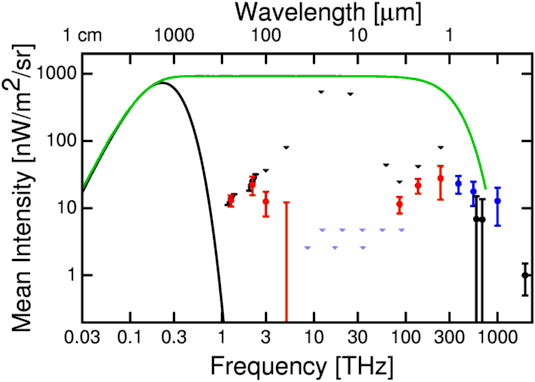Figure 2: Stolmar's model compared to FIRAS, DIRBE, HST, groundbased and far UV measurements of the cosmic background. Since Stolmar's graphs do not extend to such short wavelengths, I have evaluated my integral version of his equations numerically. Green curve: Stolmar's model. Black curve, FIRAS BB fit. Black IR points: Hauser et al. (1998) on the CIRB. Red points: Wright et al. (2000, 2001) on the CIRB. Magenta upper limits from lack of TeV gamma-ray absorption. Blue points: Bernstein et al. (2001) on the optical background. Black optical and UV points: Toller; Dube et al.; and Hurwitz et al.