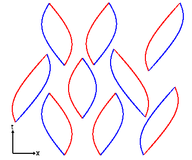 The ΩM = 1 model is on the left, the ΩM = 0.25, ΩΛ = 0.75 model is on the right. The green line across each space-time diagram shows the time when the redshift was z = 1, which corresponds to approximately to the most distant of the supernovae observed to date. Using a ruler you can see that the angular size distance to z = 1 is 1.36 times larger in the right hand diagram, which makes the observed supernovae 1.84 times fainter (0.66 magnitudes fainter).