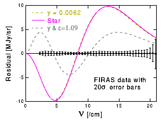 The gray dashed curve on the plot shows how much the fit can be improved by adjusting the emissivity or sky coverage of the stars. Normally the emissivity is 1-R where R is the reflectance, and thus the emissivity usually has to be less than 1. But the best fit emissivity is 1.09. So this would be unphysical unless the redshift is caused by tired light. In this case the apparent emissivity is (1+z)3 >> 1, and one can lower this down to an apparent emissivity of 1.09 by only partly covering the sky with stars. This requires some fine tuning, since for a typical stellar temperature of 4000 K a redshift of 1+z = 1466 is needed which gives an apparent emissivity of 3,150,662,696 that needs to be canceled by a sky coverage of 0.00000000034511 in this model. But the errors in the CMB fit are still 300 times larger than the FIRAS data allow, so this model can also be ruled out.