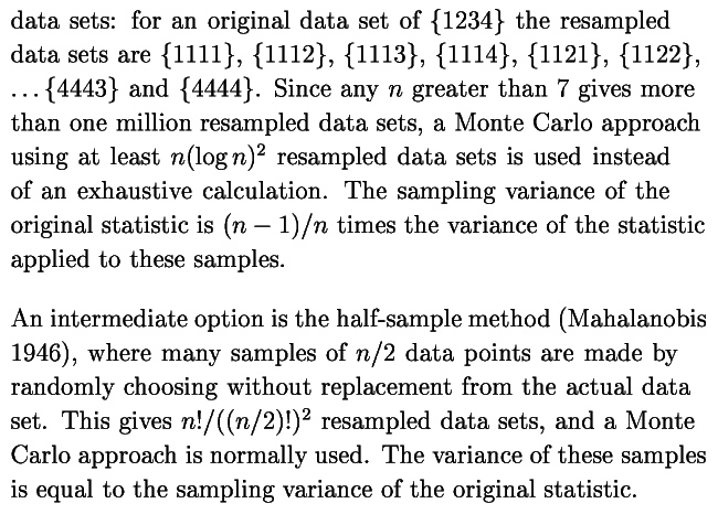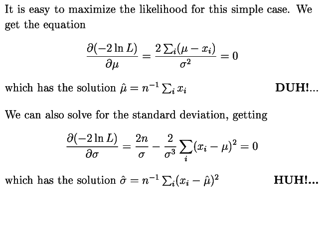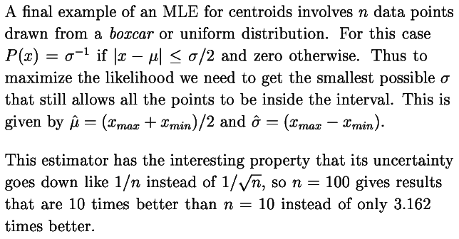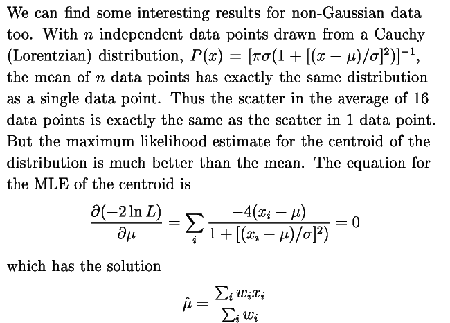 Thus the MLE (maximum likelihood estimator) for the centroid is the mean when the data are Gaussian, but the MLE for the standard deviation is biased -- the prefactor should be (n-1)-1. But for large data sets this error goes away, so the MLE's are said to be asymptotically unbiased. But if you divide your data into a large number of subsets, and get MLE's for each subset, and then average the estimators, this bias can get to be statistically significant.