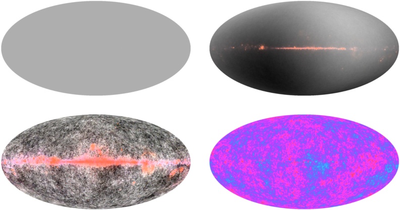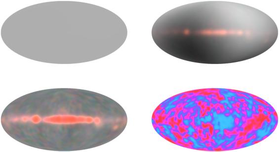 The anisotropy of the cosmic microwave background (CMB) consists of the small temperature fluctuations in the blackbody radiation left over from the Big Bang. The average temperature of this radiation is 2.725 K as measured by the FIRAS instrument on the COBE satellite. Without any contrast enhancement the CMB sky looks like the upper left panel of the figure below. But there are small temperature fluctuations superimposed on this average. One pattern is a plus or minus 0.00335 K variation with one hot pole and one cold pole: a dipole pattern. A velocity of the observer with respect to the Universe produces a dipole pattern with dT/T = v/c by the Doppler shift. The observed dipole indicates that the Solar System is moving at 368+/-2 km/sec relative to the observable Universe in the direction galactic longitude l=263.85o and latitude b=48.25o with an uncertainty slightly smaller than 0.1o. If we subtract the average temperature and expand the contrast by a factor of 400, we get the upper right panel below. This shows the dipole pattern and the emission from the Milky Way which dominates the red color in the picture, which represents the longest wavelength data. After the average temperature and the dipole pattern are removed, there are intrinsic fluctuations in the CMB which can be seen faintly away from the Milky Way in the lower left panel below, which has constrast enhanced by 2000X. Finally we can combine the multiple frequencies in a way that eliminates the Milky Way, giving the CMB map in the lower right with a 30,000X contrast enhancement.
