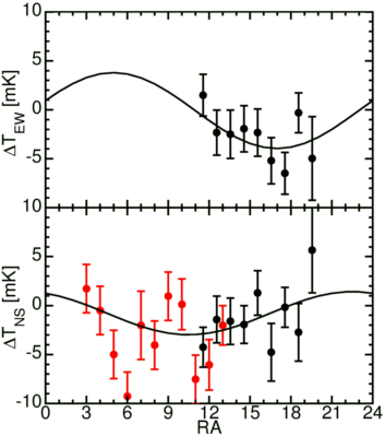 The graph at right shows a joint fit to the Henry (1971) data in red and the Corey & Wilkinson (1976) data taken from the plots in Muller's 1978 SciAm article. It gives a dipole amplitude of 2.83 mK, a right ascension of 11.2 hours, and a declination of 14o.