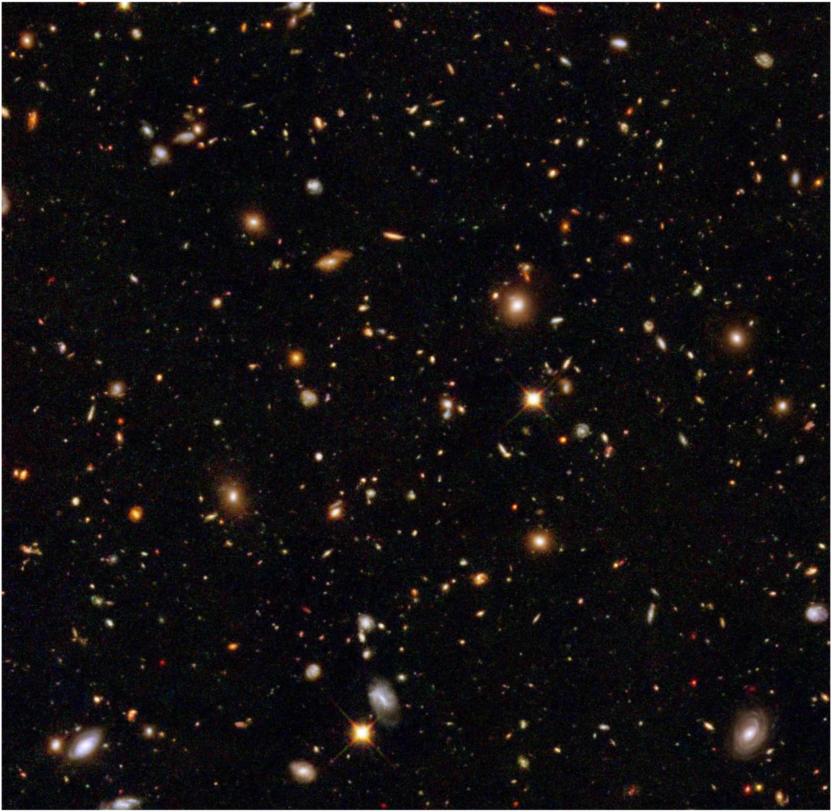 The image above is a "rollover": by moving your mouse pointer in and out of the image you can switch from the infrared (mouse out) to visible (mouse in) images of the Hubble Ultra Deep Field. I have tried to scale and align these press images so you can "blink" from one to the other.