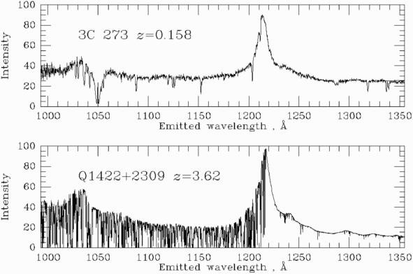 The figure below shows two actual quasar spectra. One is the nearby