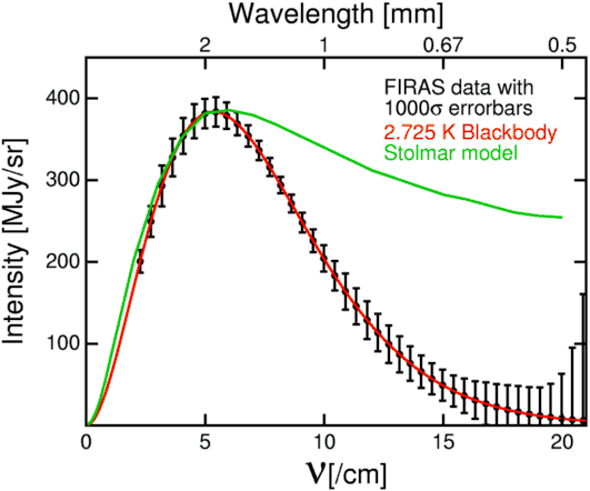 Figure 1: Stolmar's model with T* = 4000 and Rmax = 99 Glyr, which deviates from the FIRAS data by up to 13,000 standard deviations. This value of Rmax and Hd = 8.468 Glyr give ymax = 8.1 while my best match to Stolmar's curve is with ymax = 7.7. In this plot I use values read from Stolmar's graph. However, Stolmar recently changed Hd and has not updated these figures.