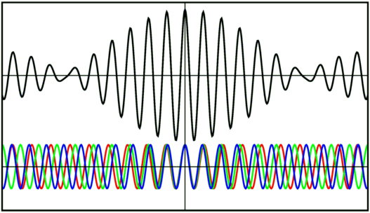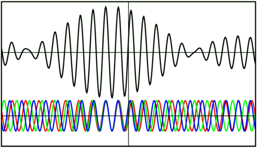 When all of the waves are delayed, but the longer wavelengths [red] are delayed