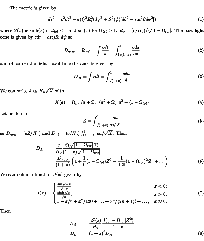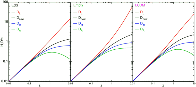 Flux = Luminosity/(4*pi*DL2)A fourth distance is based on the light travel time: Dltt = c*(to-tem). People who say that the greatest distance we can see is c*to are using this distance. But Dltt = c*(to-tem) is not a very useful distance because it is very hard to determine tem, the age of the Universe at the time of emission of the light we see. And finally, the redshift is a very important distance indicator, since astronomers can measure it easily, while the size or luminosity needed to compute DA or DL are always very hard to determine. The redshift is such a useful distance indicator that it is a shame that science journalists conspire to leave it out of stories: they must be taught the "5 w's but no z" rule in journalism school.