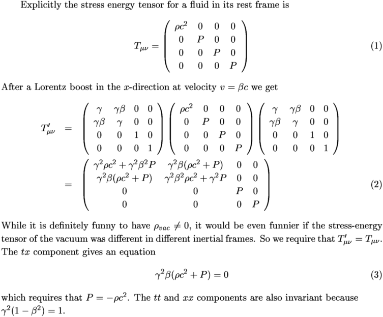 rho(vacuum) = 0.5*rho(matter)he had a total density of 1.5*rho(matter) and a total pressure of -0.5*rho(matter)*c2 since the pressure from ordinary matter is essentially zero (compared to rho*c2). Thus rho+3P/c2 = 0 and the gravitational acceleration was zero,