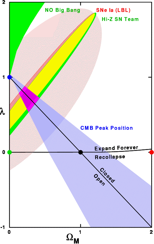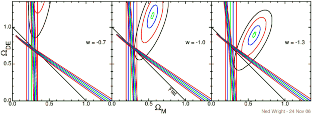 the CMB (tilted fan of lines), and the supernovae (ellipses).